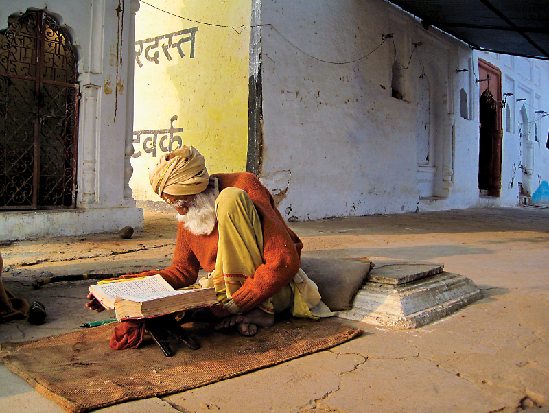 Against a backdrop of whitewashed walls, an Indian holy man studies religious texts in Delhi during our Heart of India adventure.