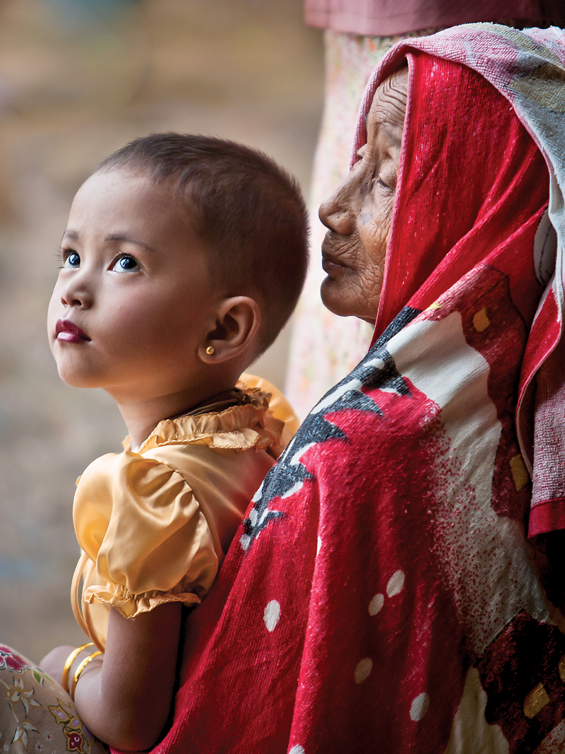 A woman holds her granddaughter while celebrating the completion of a new temple in a local village near Bagan, during the Burma & the Irrawaddy River pre-trip extension of our Ancient Kingdoms: Thailand, Laos, Vietnam & Cambodia adventure.