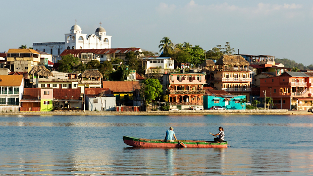 From the suburb of Santa Elena, a causeway juts out into Lake Petén Itzá to Flores, a charming island town of Spanish-style homes and bright red roofs. Navigating through the narrow cobblestone streets will reveal quaint residences and small street-side cafes and plazas.