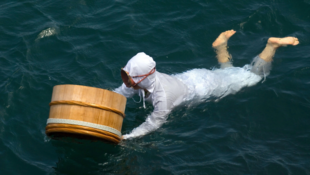 The city of Toba sits on the Japanese coast facing Ise Bay and is known for its oysters and pearls. The city's Mikimoto Pearl Island is the birthplace of cultured pearl aquafarming where ama, or “sea women,” dive for the pearls without a breathing apparatus. Pearl farming began on the island in 1893, but today it hosts a model factory where women collect the pearls as a performance. Outside of the tourist center, ama still actively work in small fishing villages by diving for abalone, seaweed, and other seafood.