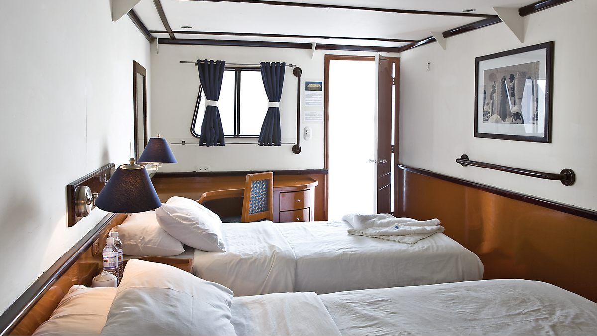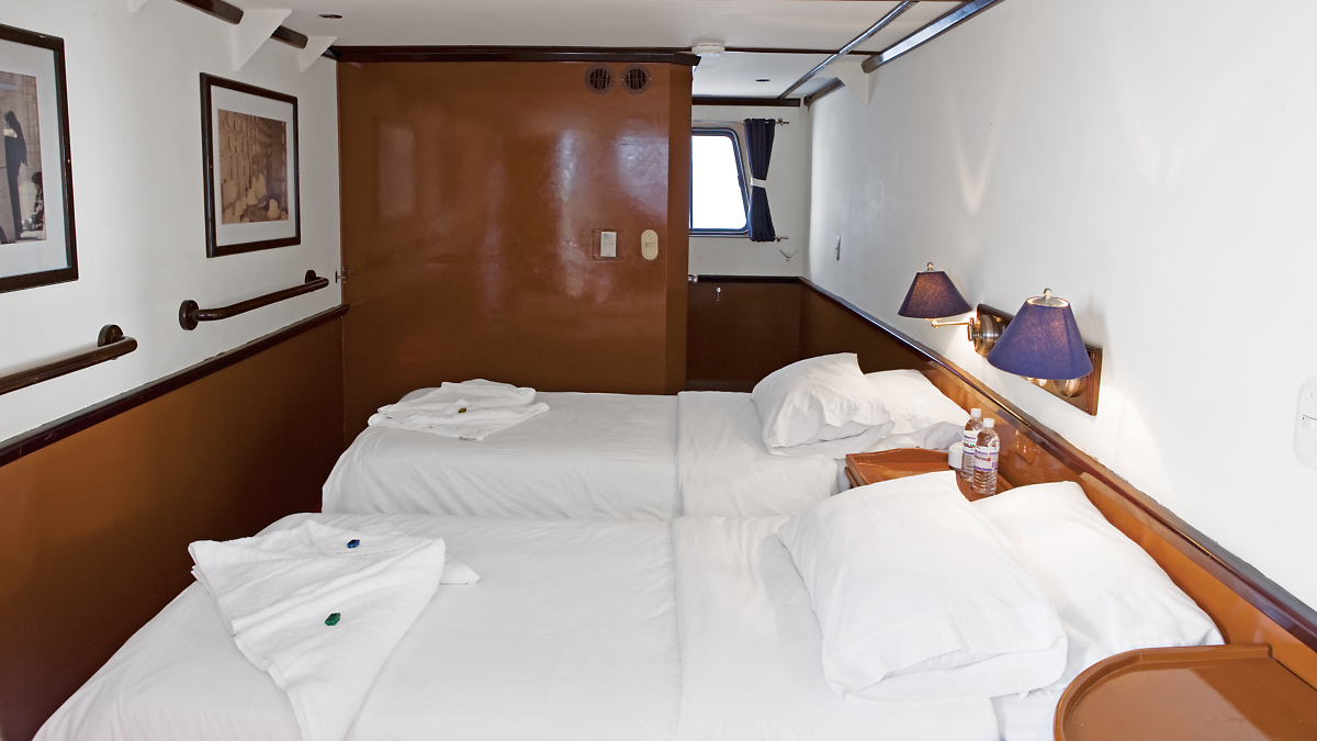 Your Galápagos small ship features two passenger decks with a dining room and small lounge. Cabins are located on both decks and all feature windows and private bathrooms.